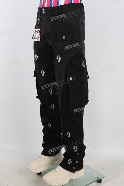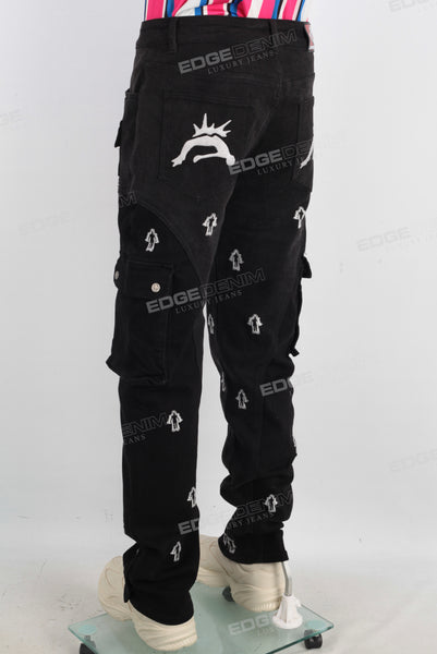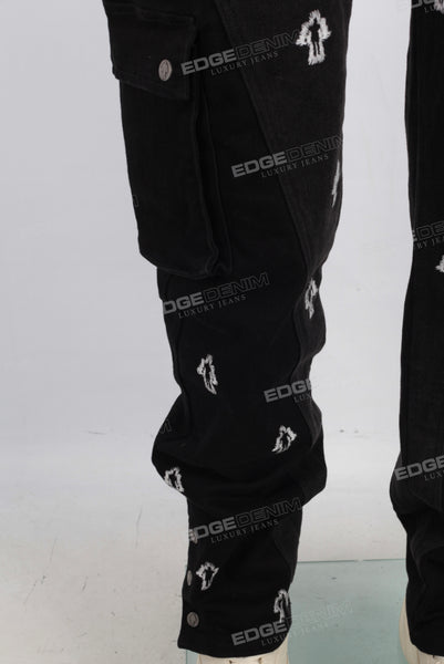 Black embroidered patchwork cargo jeans
