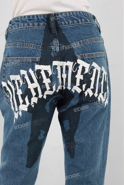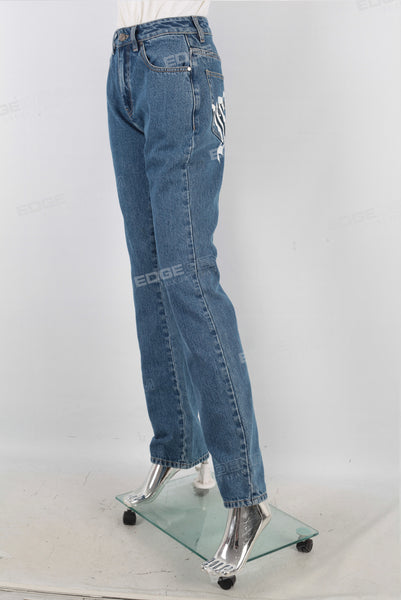 Blue digital print straight jeans women