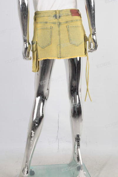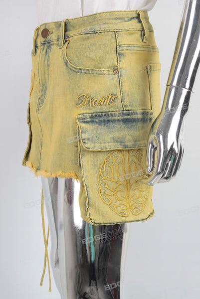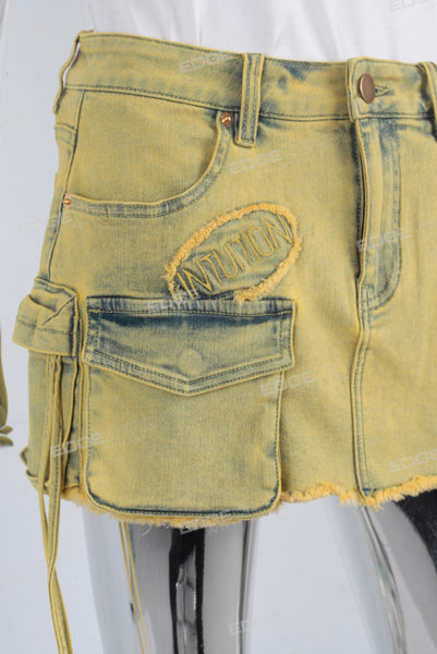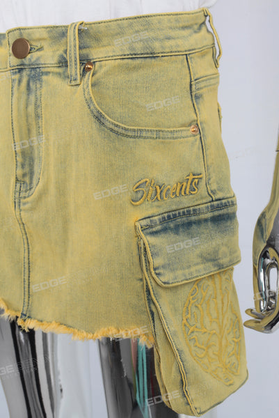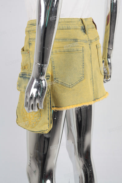 Yellow embroidered patchwork cargo skirt